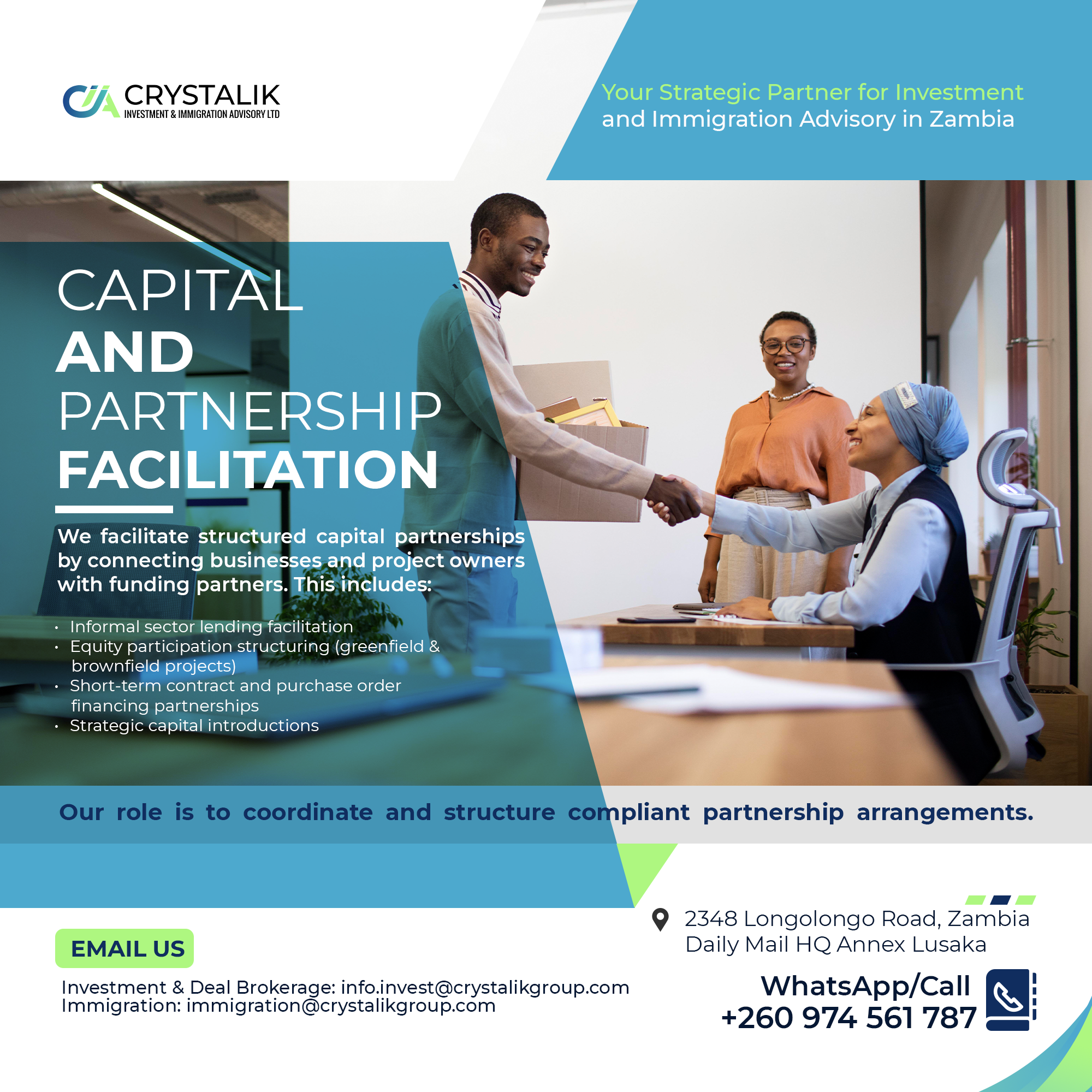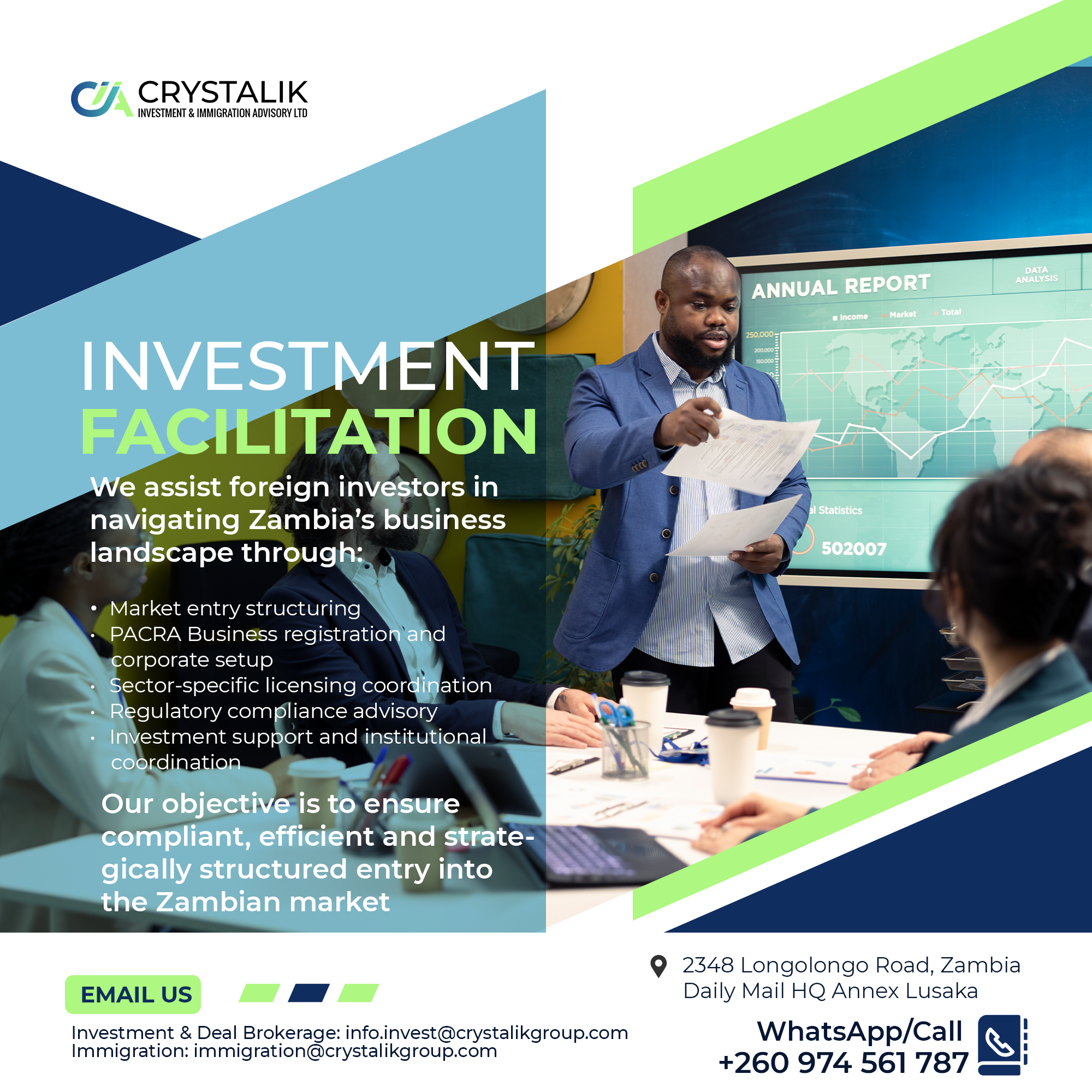 is a Zambia-based advisory firm providing structured support to foreign investors, businesses and strategic partners seeking to establish and operate within Zambia’s regulatory framework.